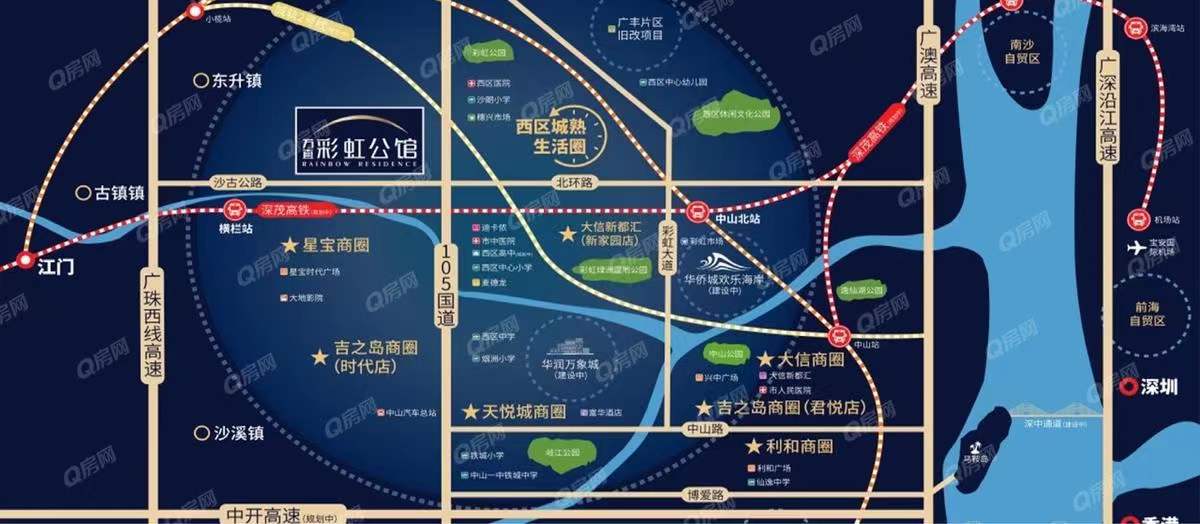5-10分鐘即可到達(dá)沙朗壹加壹、石岐大信商圏、天悅城商圈、富華商圈、星寶商圈、興中廣場商圈、吉之島商圈、迪卡依、麥德龍等,末來還會(huì)有馬山舊改的華潤萬象城、華僑城歡樂海岸等大型配套