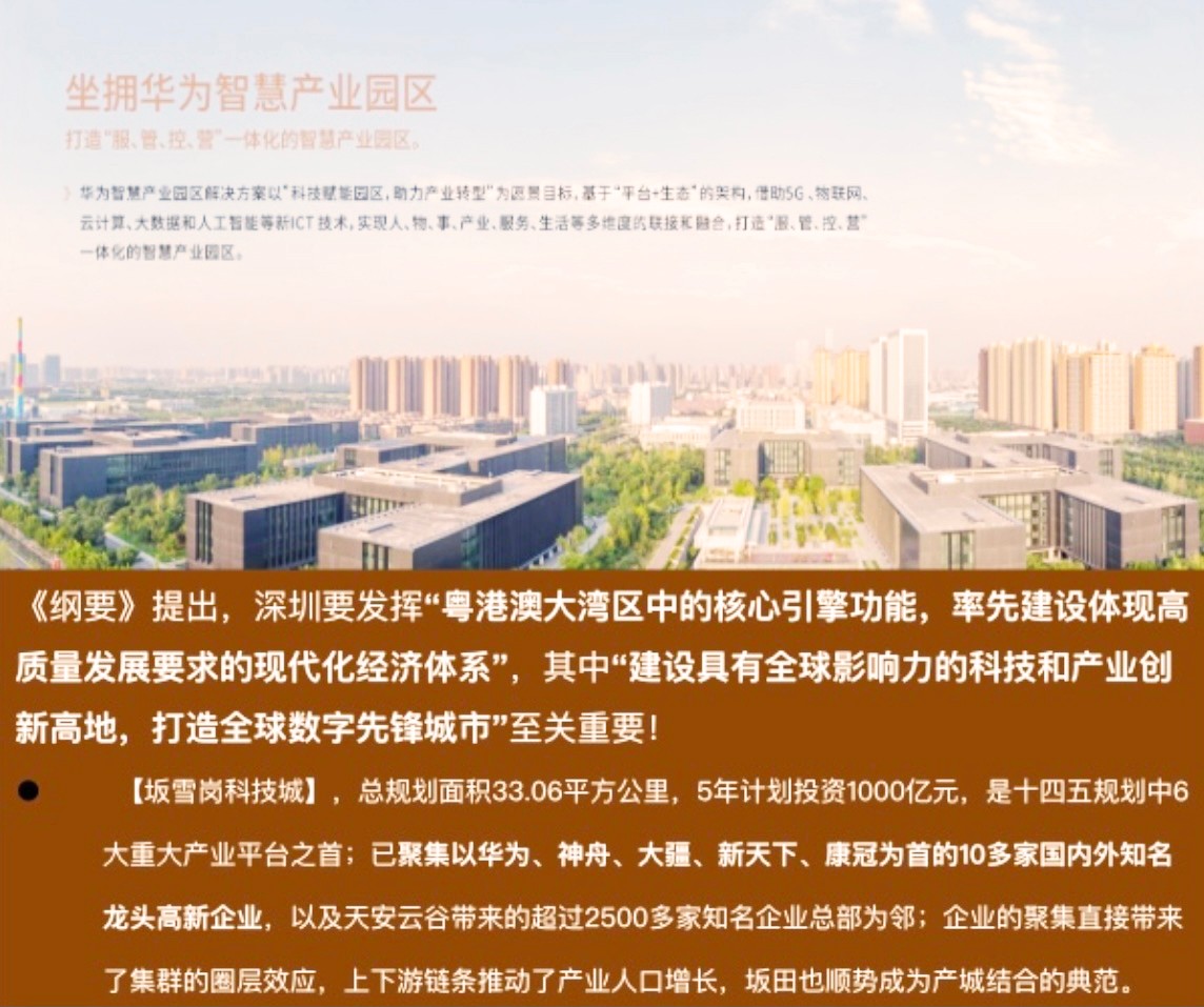 2021年6月發布《深圳市十四五規劃綱要》,提出“東進、西協、南聯、北拓、中優的發展戰略”,同 坐擁華為智慧產業園區