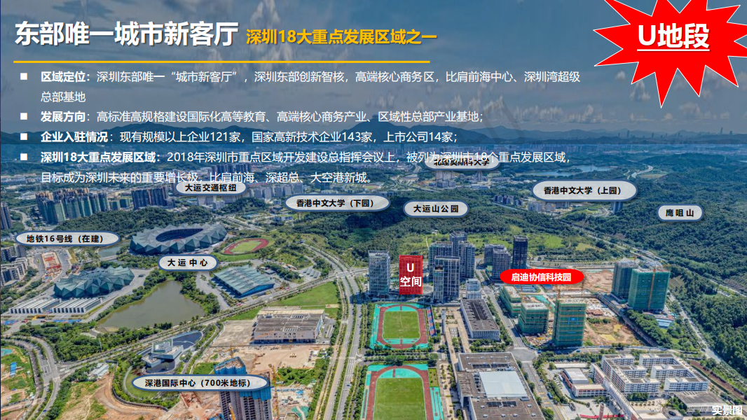 • 大運新城總用地面積約 15.93 平方公里,是深圳市18個重點發展片區之一,也是深圳 6 大“城市新客廳”之一,定位對標前海、深圳灣、香蜜湖等,是集中龍崗區優勢的資金和資源,重點發展高端核心商務、區域性總部經濟、AIOT(人工智能物聯網)產業,現有規模以上企業 121 家,國家高新技術企業 143 家,上市公司 14 ,規劃產業用地 212.12 公頃,規劃產業用房 499.31萬平方米,是龍崗區落實“東進戰略”,打造龍崗高質量發展的重點片區!