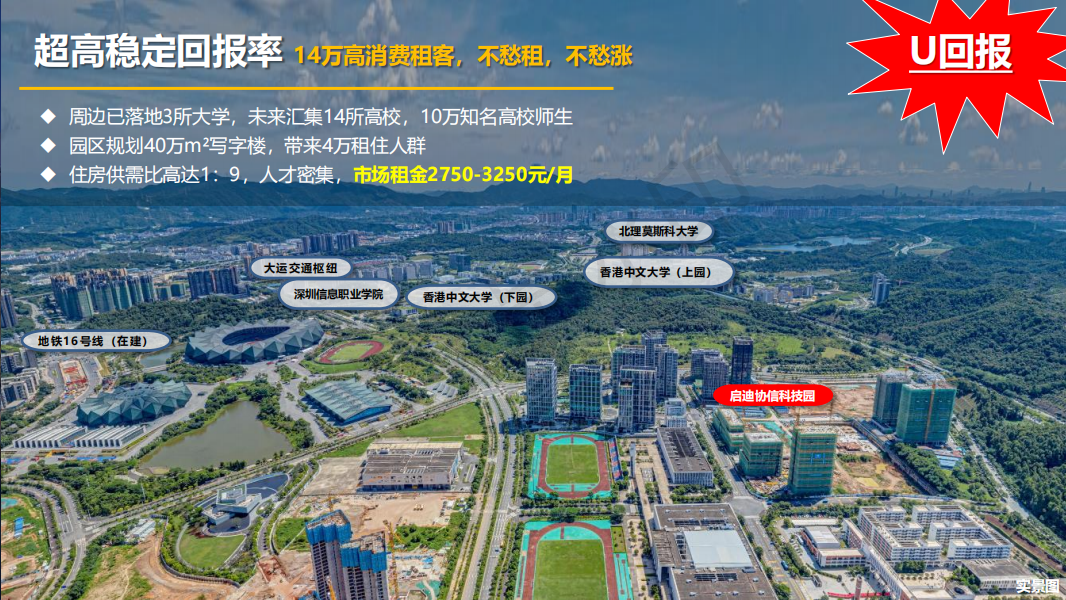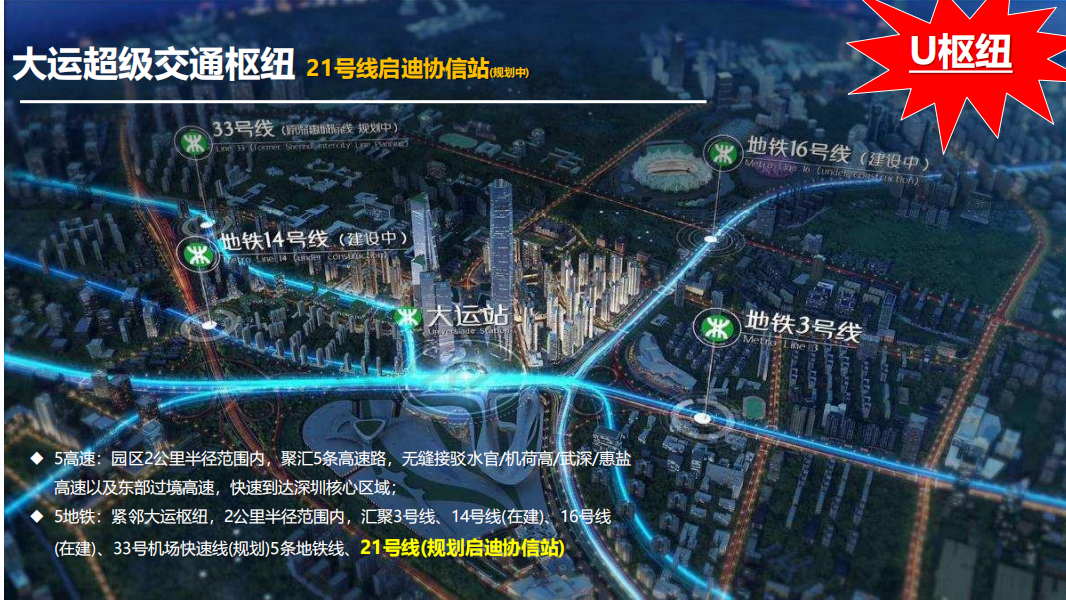 第五個就是我們【U空間】所在的啟迪協信科技園,占據大運新城中部位置,由風采路-青春路-鹽龍大道與東面龍飛大道圍合而成,經龍飛大道、鹽龍大道可便捷接駁水官高效通達深圳各區域中心。軌道交通方面,有已開通的地鐵 3 號線大運中心站;周邊還有在建的地鐵1416 號線以及規劃中的 2133 號線,與我們項目最緊密相關的是規劃21號線啟迪協信站,未來項目周邊將有 5 線地鐵交匯、環繞。