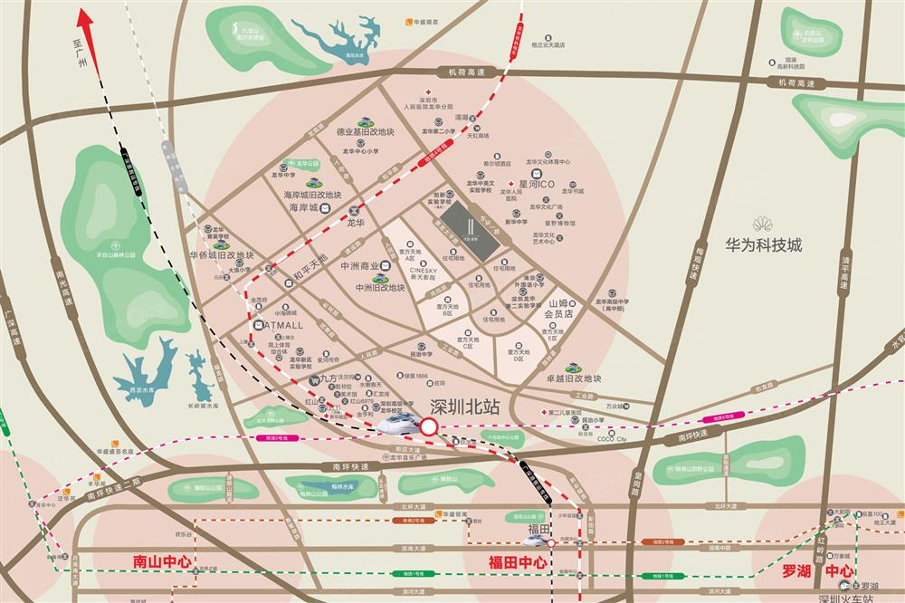 粵港澳大灣區(qū)交通樞紐,毗鄰地鐵4號線龍華站,四站換乘深圳北站,廣深港高鐵由北站到香港西九龍約18分鐘